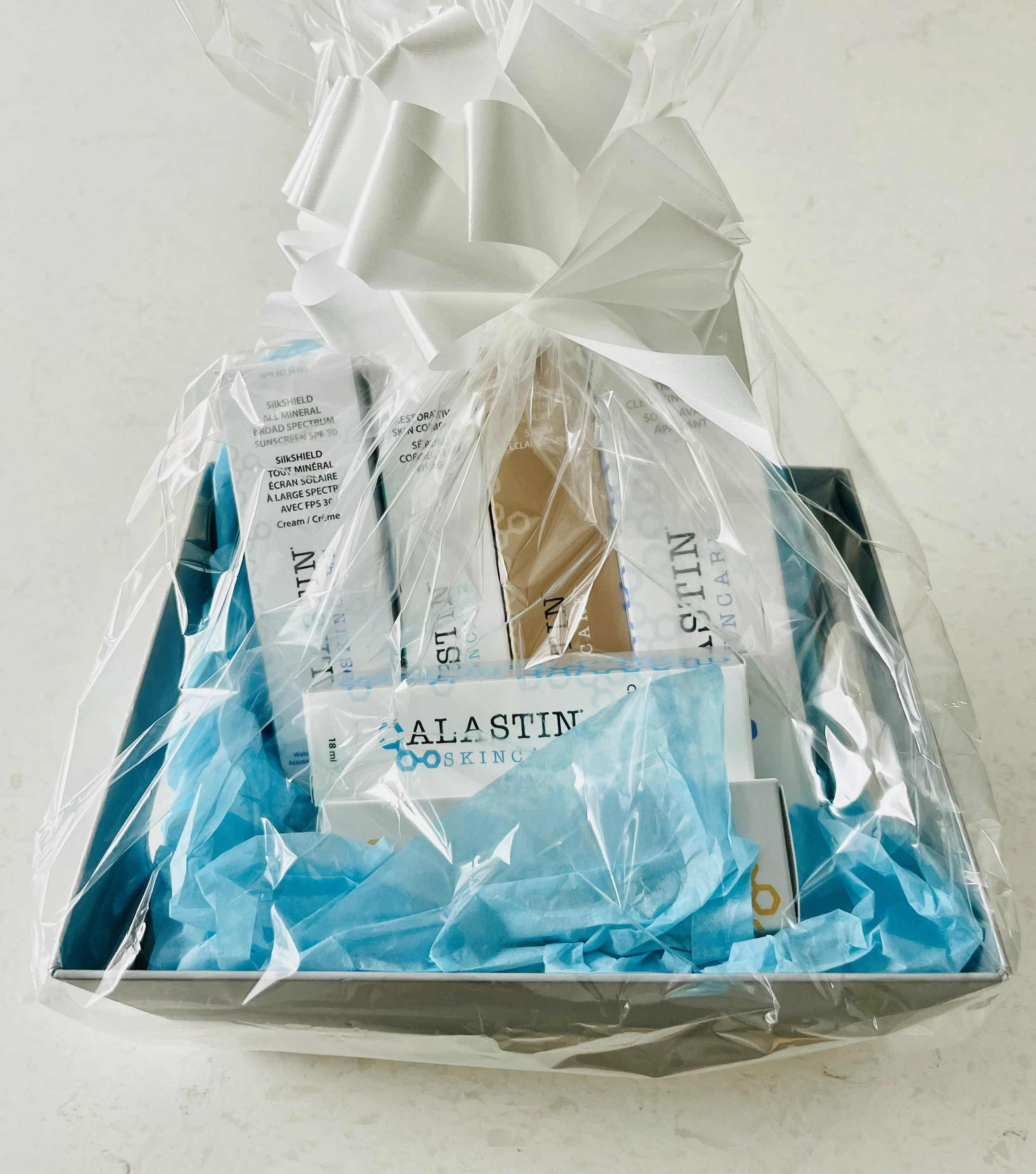 A gift basket containing an elegant assortment of Alastin Beauty Products.